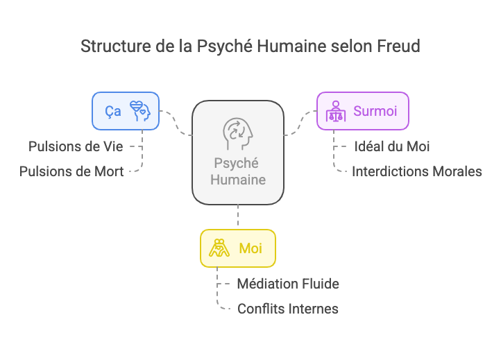 Selon Freud, notre monde intérieur est composé de trois instances principales : le Ça, le Surmoi et le Moi.