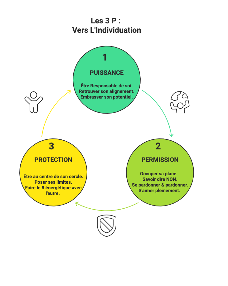 Cependant, vient un moment où l’intensité de la souffrance contraint l’individu à quitter sa position d’objet du triangle pour redevenir sujet. À partir de là, le triangle peut s’incliner et se réorganiser autour de deux fondements essentiels : la protection et la permission d’être authentiquement soi-même. C’est sur ces bases que chacun peut retrouver sa puissance, se réapproprier sa responsabilité et rayonner pleinement de tout son potentiel. Ainsi peut commencer le chemin vers Le SOI, vers L’INDIVIDUATION selon Carl Gustav Jung. L’Individuation est un processus évolutif, qui se déroule tout au long de la vie. Ce n’est pas devenir “parfait”, mais devenir réellement soi, libéré des conditionnements, des masques sociaux et des projections.