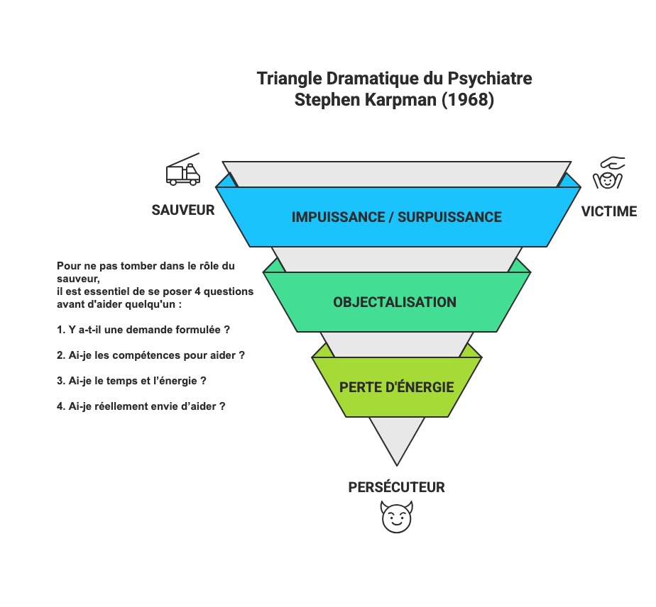 Le triangle dramatique a été créé en 1968 par Stephen Karpman, psychiatre américain et élève d’Eric Berne, reconnu pour ses travaux en Analyse Transactionnelle. Sa théorie décrit trois rôles relationnels répétitifs : la Victime, le Persécuteur et surtout le Sauveur, qui intervient souvent sans qu’on lui ait rien demandé.
